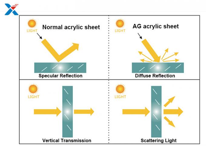 แผ่นอะคริลิกป้องกันแสงสะท้อนเป็นผลสะท้อนแบบกระจายหลายมุมหลังจากที่พื้นผิวของแผ่นอะคริลิกได้รับการดูแลเป็นพิเศษด้านใดด้านหนึ่งหรือทั้งสองด้าน จึงปรับปรุงมุมมองของภาพ ลดการรบกวนของแสงโดยรอบ และลดการสะท้อนของหน้าจอ .ดังนั้นจึงดูมีหมอกบนพื้นผิวและการส่งผ่านแสงจะต่ำกว่าแผ่นอะคริลิกใสทั่วไป